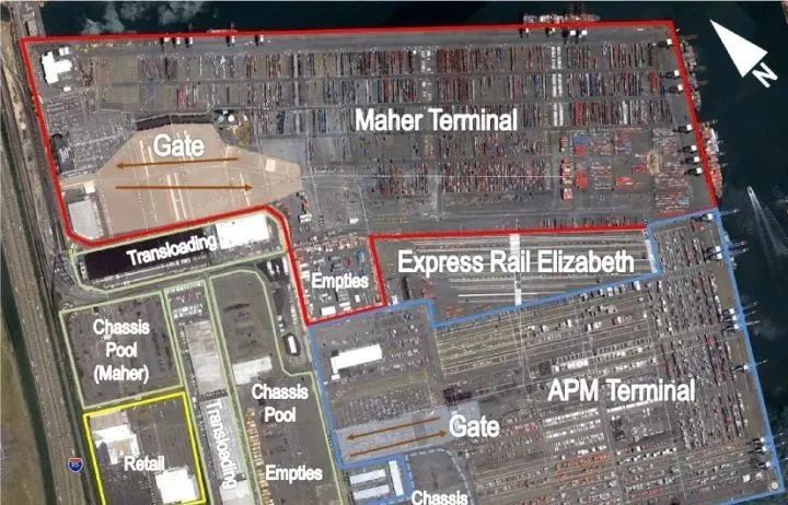 在NY/NJ港口有5個(gè)主要的集裝箱碼頭:PNCT(主要由MSC使用);Maher(港區(qū)最大的碼頭,被許多船東使用:CMA CGM/ONE/COSCO/Hapag Lloyd/ZIM等),APM Elizabeth碼頭(馬士基的碼頭,主要由2M使用),GCT Bayonne和GCT New York(主要由萬(wàn)海和MSC使用)。