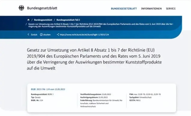 2023年5月11日,德國通過了一次性塑料基金法(EWKFondsG),該立法旨在執(zhí)行歐盟發(fā)布的《關于減少某些塑料制品對環(huán)境影響的第2019/904號指令》,以減少和防止一次性塑料產品對環(huán)境的負面影響。
